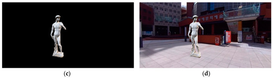 At the same time as the recording, a 360° video clip and the external parameters of the stereo vision were transmitted to the Unity 3D game engine to create a virtual camera for pre-visualization. Figure 9 shows the results of the pre-visualization of the indoor and outdoor scenes while recording the 360° video. The result displayed through the pre-visualization system was used to confirm the composition result. For the final video, further composition processes such as lighting, shadowing, and texturing in 3D software are needed.