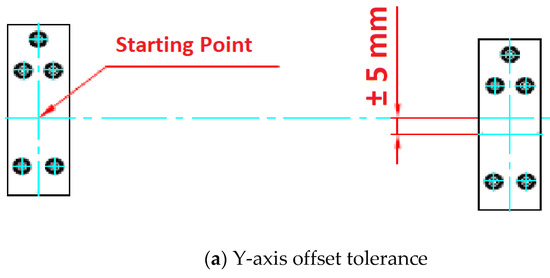 Based on the design tolerance provided by the manufacturer, as shown in Figure 16, the offset on the X-axis (±3 mm), Y-axis (±5 mm), and Z-axis (±10 mm) need to be evaluated and measured, as shown in Figure 9. To measure the torsion deviation, each anchor plate was controlled by four check-points, which are the four corners. The errors were calculated manually by comparing the created BIM model and the scanned point cloud data, as shown in Figure 17.