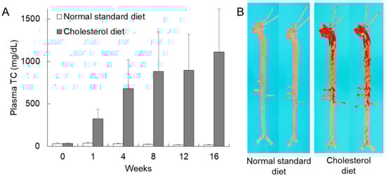 Hypercholesterolemia and representative aortic atherosclerosis of cholesterol-fed rabbits. (A) Plasma total cholesterol (TC) levels of wild-type rabbits fed either a normal standard diet or a cholesterol diet containing 0.3% cholesterol and 3% soybean oil for 16 weeks. Mean ± SD (n = 4–20). (B) Aortic gross lesion stained with Sudan IV can be seen in rabbits fed a cholesterol diet (right).