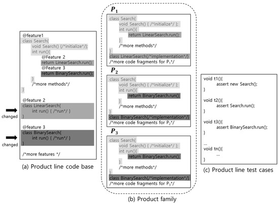 Figure 1 presents an SPL project: (a) product line code base, (b) a product family that has three products, P1, P2 and P3 and (c) test cases, t1, t2, …tn. t1 and t2 are common to all the products and t3 is common to P2 and P3. The products of the family are produced by copying code fragments for each product from the product line code base. For example, P1 is produced by copying the code fragments of @Feature 1 and @Feature 2 and, P2 and P3 are produced by copying the code fragments of @Feature 1 and @Feature 3. These products have common code fragments between them. P1, P2 and P3 share the code fragments of @Feature 1, and P2 and P3 share the code fragments of @Feature 3. The code fragments of @Feature 2 are unique to P1. In practice, this approach has been used by some major companies that adopted product line development [14,15] and also by well-known existing SPL development tools such as FeatureIDE [16], Pure::variants [17] and CIDE [18].