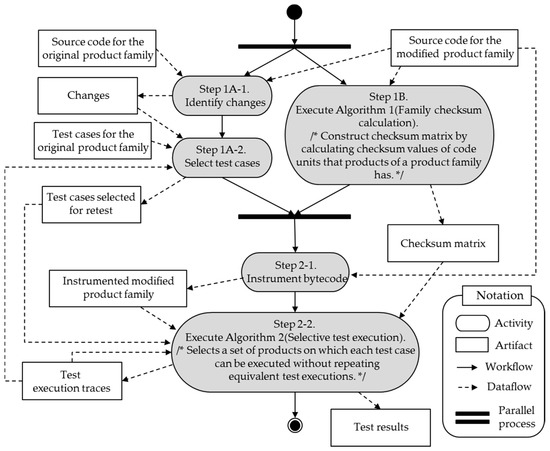 A typical RTS method is conducted in three phases [13]: the Analysis (A) phase for identifying the changes and selecting test cases for retest, the Execution (E) phase for executing the selected test cases and the Collection (C) phase for collecting information (e.g., test execution traces) from the current version to enable analysis for the next version. Our method includes all these phases and performs, additionally, the Family Checksum (FC) phase for obtaining checksum values of source code for the product family.
