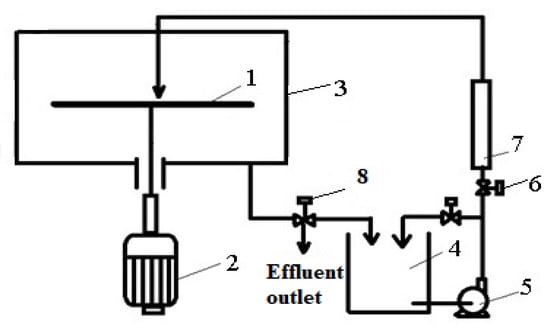 Experimental setup for the wastewater quality measurements. 1—rotating disc; 2—electric motor; 3—housing; 4—tank; 5—centrifugal pump; 6—adjusting tap; 7—flowmeter; 8—tap.