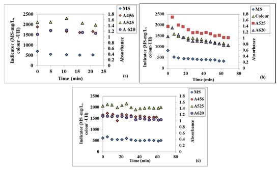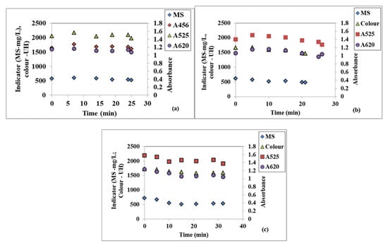 Variation in the time of the textile WW suspended solids (MS) and colour at 10 L/h flowrate and three different rotational speeds: (a) 100 rpm, (b) 300 rpm, (c) 500 rpm.