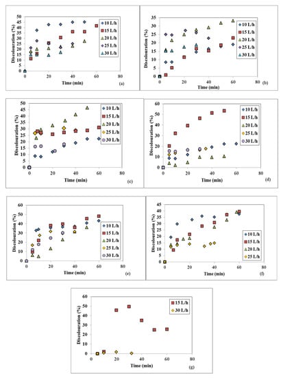 The color removal for five different WW flowrates fed on the spinning disc at constant disc rotational speeds is represented in Figure 4a–g. As one can observe in Figure 4a, the highest removals of color at 100 rpm were 45.21% at 10 L/h after 50 min and 41.67% at 15 L/h after 60 min; as the WW flowrate increased, the maximum attained discoloration efficiency decreased. At 250 rpm, the maximum color removal was 33.16% for 20 L/h after 60 min, as seen in Figure 4b, while at 400 rpm the maximum registered value was 46.48% at 20 L/h after 50 min (Figure 4c). The best color removal among these runs was 53.50%, registered at 15 L/h and 550 rpm, after a 50 min operating time interval of the SD setup (Figure 4d). At the 850 rpm disc rotational speed, the maximum discoloration was 48.03% at 15 L/h after 60 min, as shown in Figure 4e, while at 1200 rpm the largest values of color removal was 39.56% at 15 L/h after 60 min (Figure 4f). No relevant data were obtained at 1200 rpm and 30 L/h, thus this flowrate is not represented. One can notice that at the largest investigated rotational speed of 1500 rpm for the 15 L/h flowrate, the discoloration efficiency increased, reaching 49.64%, after 30 min, and then decreased, while the other measured flowrates did not render any improvements regarding the color removal, thus they are not represented in Figure 4g.
