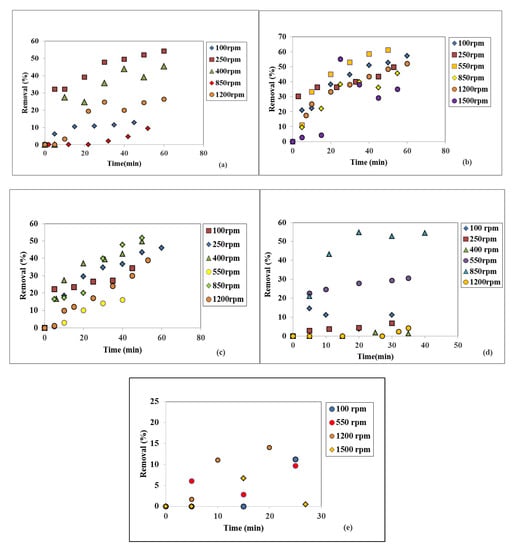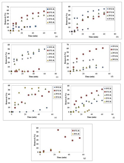 In Figure 7a–e, the suspended solids removals are plotted as the variation in time for the above-mentioned seven rotational speeds and five WW flowrate values. At 10 L/h, the 250 rpm rendered a maximum suspended solids removal of 54.29% after 60 min (Figure 7a), while at 15 L/h 550 rpm gave the highest removal of 61.13% after 50 min (Figure 7b). For both 20 L/h and 25 L/h flowrates, at a rotational speed of 850 rpm the maximum suspended solids removals of 51.88% after 50 min (Figure 7c) and 54.51% after 40 min (Figure 7d) were obtained. At the largest WW flowrate of 30 L/h, the 1200 rpm gives a removal of only 14.08% after 25 min, as seen in Figure 7d.