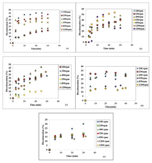 Influence of the disc rotational speed on discoloration at different WW flowrates: (a) 10 L/h, (b) 15 L/h, (c) 20 L/h, (d) 25 L/h, (e) 30 L/h.
