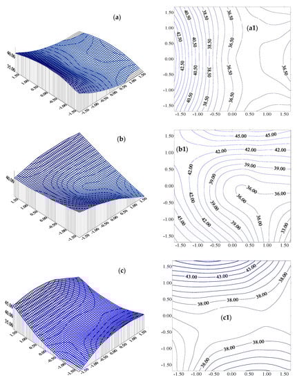 Figure 8(a,a1)–(c,c1) and Figure 9a–c illustrate the dependence of the WW suspended solids removal (Y1) vs. two independent variables (one variable was kept at the basic value) (i.e.,Y1 = Y1(X1,X2,0); Y1 = Y1(X1,0,X3), and Y1 = Y1(0,X2,X3) with their isolines) and one independent variable (two variables were maintained at their basic values).