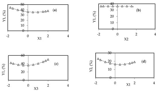 Figure 9d illustrates the dependence of textile WW discoloration (Y2) on one significant independent variable (X1) (X2 and X3 are constant, at their basic value and not influencing theY2 value).