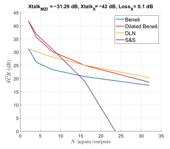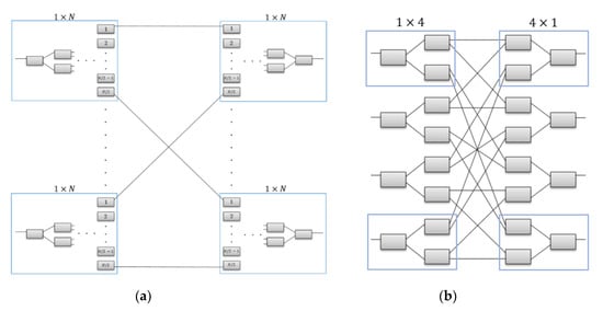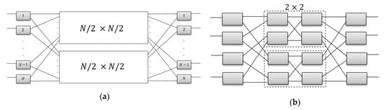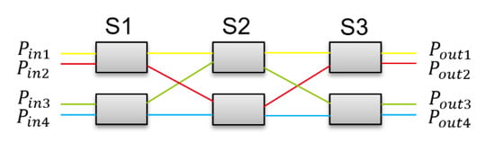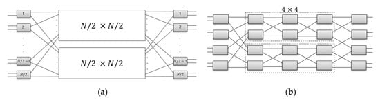 - Kabacinski, W. Modified Dilated Benes Networks for Photonic Switching. IEEE Trans. Commun. 1999, 47, 1253–1259. [Google Scholar] [CrossRef]
