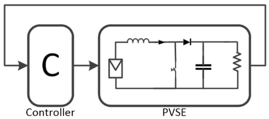 In voltage control (VC) mode, a classic proportional integral (PI) controller is in charge of maintaining the DC-DC PEC output voltage Vout at a user-defined level [58]. Figure 6 illustrates the PVS diagram with the PI controller, this controller monitors the converter output voltage level (Vout) performing control actions to eliminate the effects generated by system disturbances (connection and disconnection of loads to the output). The PI controller model that defines the control action u(t) in terms of the error e(t), is shown in Equation (6).