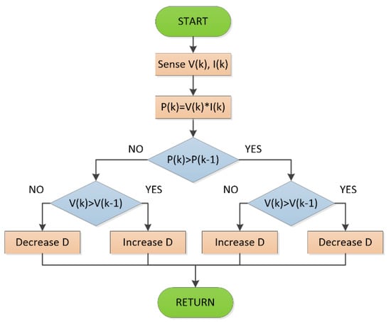 In the MPPT mode of operation the PEC extracts maximum power from the PVP using the P&O algorithm illustrated in Figure 4. The controller modifies the D of the power switch and monitors the changes in the voltage and power of the PVP always seeking an increase in the power extracted from the PVP [57]. The controller for MPPT is based on the Hill Climbing algorithm: if the power delivered by the PVP [P(k)] increases with a variation in D, the controller verifies changes in the PVP voltage level [V(k)], if it decreases D increases, and if it increases D decreases. If, on the other hand, P(k) decreases, a decrease in V(k) represents a decrease in D and an increase causes an increase in D. In Figure 5 the diagram of the PVS with the controller for the MPPT is presented. A similar system is used in [42].