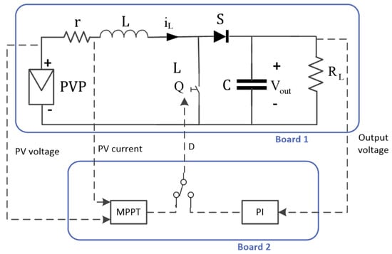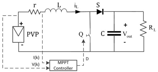 The DC-DC boost PEC transfers energy from the PVP to the load, its objective is to generate a voltage at the output Vout, greater than the voltage of the PVP Vin, which is related to the duty cycle D of the power switch Q. The converter diagram shown in Figure 3, comprises the input and output voltages (Vin and Vout), an inductor L, a resistor inductor r, a capacitor C, a fast recovery diode S, a power switch Q and a load resistor RL. The mathematical model of this converter [56] is presented in Equation (5).