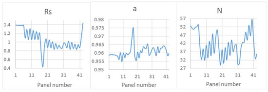 With the information obtained on the behavior of the variables Voc, Vmpp, Isc and Impp, of the 43 commercial PVPs, the operating ranges of the variables Rs, a and N (Equations (2)–(4)) were evaluated. Figure 7 shows the graphs of the values obtained for these variables considering all possible values. When analyzing these values, the following operating ranges are defined: the variable Rs works between 0.43 and 1.44, the variable a between the values 0.955 and 0.975, while the variable N operates between 28.85 and 56.58. In the three graphs, it was observed that the variables take similar values for each of the PVPs. This trend allows defining the weight of the data type assigned to each one. To define the number of bits used in the integer part, the largest value obtained in the calculations was taken as a reference. When comparing the decimal part of each set of values, variations of the order of 0.01 were observed. One byte was allocated to the fractional part of each variable, in this way the resolution is less than the observed variations. Table 2 shows the weights assigned to these variables.