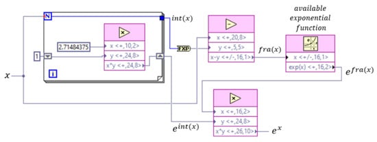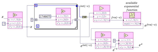 Subsequently, if x < −1 then −x > 1, and if the integer part of −x is denoted with int(−x) and with fra(−x) to the fractional part, the exponential function is calculated as shown by Equation (9). In this way, the term eint(-x) can be calculated in a for loop as in the previous case, while efra(−x) can be calculated with the available function because fra(−x) < 1. The algorithm used to describe this expression is shown in Figure 9.
