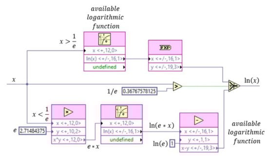 The available ln(x) function only admits values between and 1, in this case the scaling of the argument of the logarithm is proposed as shown in Equation (10). In this way, what is sought is that the product x*c is in a valid range for the function and since the constant is known, its logarithm will also be known. Figure 10 shows the code to calculate the logarithm of a variable x that takes values between the reciprocal of the square of e and the unit. With the proposed algorithms it is possible to calculate the functions nx and ln(x) using a high-level language, this allows the development of complex applications for non-expert users [29].