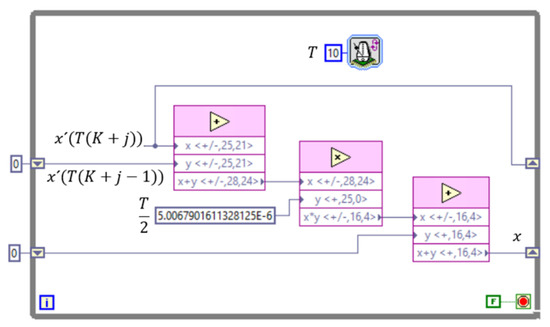 For the implementation of the integrals in the FPGA, the trapezoidal integration method was used, in this way, if the state variables are denoted with x, the integral can be calculated according to Equation (16). Figure 11 shows the algorithm used for the implementation of Equation (16) in the FPGA with a period of 10 µsec.