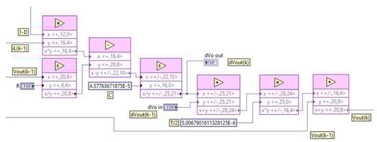To define the integration period, a similar procedure was carried out. Initially a period was assigned and an experiment was carried out, observing the behavior of the output of the open-loop system. Subsequently, the period was reduced and the weight of the selected data type was modified in the constant that represents this data (T/2 in Figure 11, Figure 12 and Figure 13). As the data type weights change, the time required to run a simulation step also changes. The process described is carried out interactively until the programmed period corresponds to the actual execution period. Another aspect that must be considered is that the algorithm for calculating the integrals depends on the voltage value calculated in the PVPE, so that the integration period must be greater than the time that the PVPE takes to execute a step. Taking these considerations into account, the period in loop containing the structures shown in Figure 12 and Figure 13 was 10 µs.