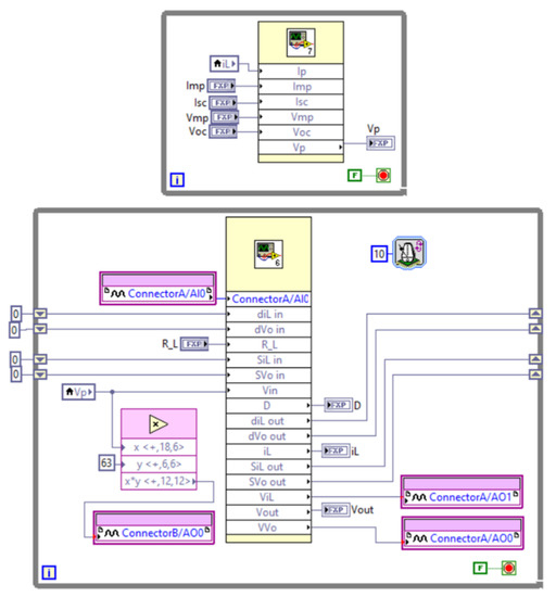 For the design of the PVSE, the VIs from the PVPE and BCE models were integrated as subVIs (a subVI is similar to a subroutine in text-based programming languages) in a general VI. This interface has Voc, Vmpp, Isc, Impp and the resistance load RL of the converter as inputs. The PVPE subVI has the PVPE current as its input and the PVPE voltage as its output. The BCE’s subVI has duty cycle and voltage Vin(t) as inputs, and iL(t) and Vout(t) as outputs. For the connection between the PVPE and the BCE, the current in the inductor of the converter was used as the input to the PVPE, and the voltage of the PVPE was used as the input voltage in the converter. The PVSE VI has a voltage input that represents the duty cycle of the converter and three voltage outputs that represent the PVP voltage, the PVP current and the voltage at the converter output Vout(t). The algorithm used for the PVSE is illustrated in Figure 14.