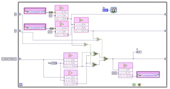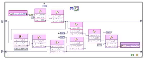 The VI of the PI CSE has two controls for proportional (kp) and integral (ki) gains; in addition, another control for the set point. The comprehensive control action was implemented with the trapezoidal integration method using the same methodology described above for the BCE. The PI CSE has a voltage input to monitor the converter output voltage and a voltage output that represents the duty cycle; the implementation of this controller is illustrated in Figure 16. The input and output signals of the PI CSE take values between 0 and 5 V representing ranges from 0 to 204 V and 0 to 100% for the inverter output voltage variables and duty cycle, respectively.