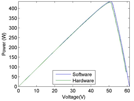 The HIL platform of the PVPE allows the generation of different I-V curves for PVPs by manipulating the values of the desired power in real time, giving the user the option to check the behavior of the controllers reproducing diverse climatic changes, offering advantages in the experimental stage compared to real systems, in which the climatic conditions cannot be manipulated, or in proposals where the I-V curve emulated by the platform is unique [45]. The proposed HIL platform is programmed in an environment with high-level graphic language that allows researchers and educators to reproduce and reconfigure the proposed emulator in a faster and easier way compared to methodologies that propose the use of multiple software, for example [42] that proposes the use of VHDL as a programming language.