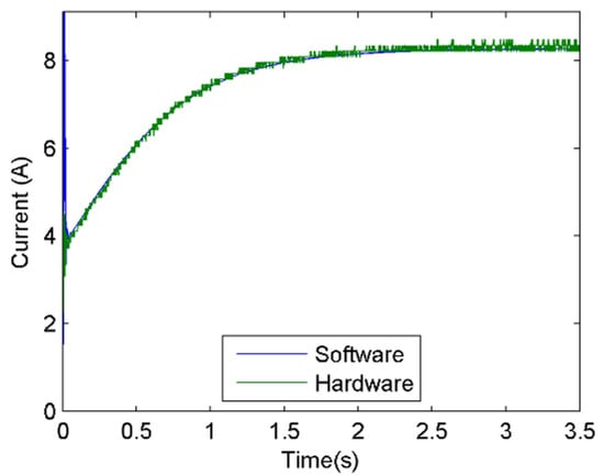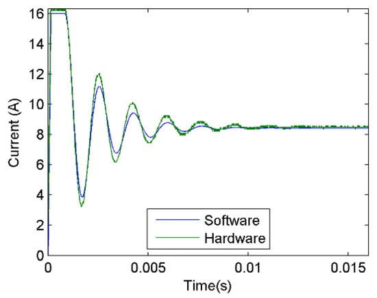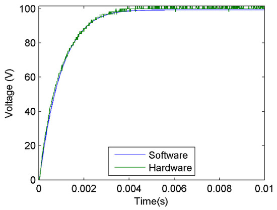 The HIL system developed in this study simulates the PVS with integration times of 10 µs, this timing, although turning out to be longer compared to the studies developed in commercial platforms, is similar to the results obtained in research reported in the literature; [32] obtains simulation periods between 1.1 and 19.9 ms, [43] reports periods of 20 µs, the platform developed by [46] presents periods of 5 µs, in the study by [44] results for this 10 µs variable are reported, [47] reports periods between 200 ns and 2 µs, in [42] a period of 1 ms is used and finally [40,41] report periods of 50 µs. On the other hand, if the response of the PVSE presented in Figure 22 is analyzed as a first order system, it would have a time constant of approximately 990 microseconds, which means that with the integration time of the PVS around 99 values are calculated for the output for each time constant, allowing to emulate a continuous signal. The proposed investigation was developed using generic software, obtaining integration times similar to dedicated platforms, but at a lower cost.