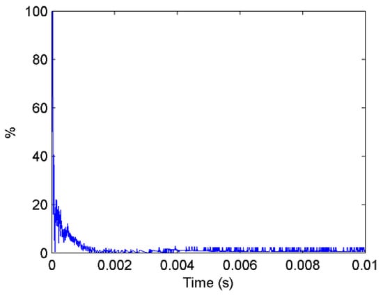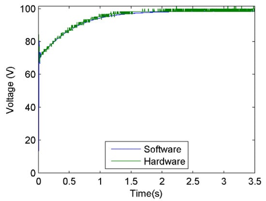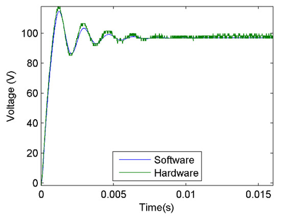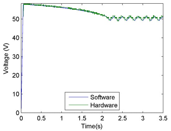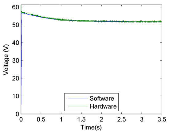 Concerning the accuracy of the system, when comparing the results obtained with the software simulation, the emulator presented a mean absolute error of 1.0930 V and a mean percent error of −2.0478%. These values tend to be large in the samples taken at the start of the converter output voltage response. The period in which the error obtained is greater corresponds to the time in which the output takes small values, close to zero at the beginning of this period, so that, although the error is significant for that section of the response, this does not imply a higher variation. Taking this into account, the result obtained when reproducing the behavior of the PVS is satisfactory.