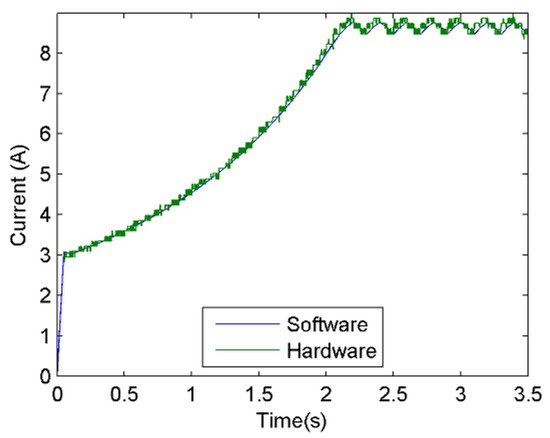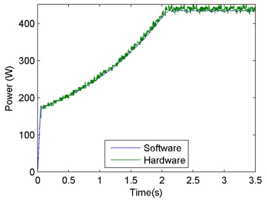 The most important aspect that the HIL technique must satisfy is that the simulation is carried out in real time; furthermore, the emulator must have a numerical precision such that it is capable of reproducing the behavior of the emulated system without much margin for error. To evaluate the execution time of each integration cycle, the fidelity of the implemented PVSE and its usefulness in the control system validation process, the operation of each independent emulator was tested to later integrate all the subsystems. In addition, each of these experiments were compared to software simulations using Matlab’s Simulink. In the software simulation, Equations (1) and (15) were implemented to model the PVP and the DC-DC PEC, correspondingly. The integrals were solved using continuous integrators in Matlab’s Simulink. The solver of the block diagram was configured with a Dorman–Prince method with variable step.