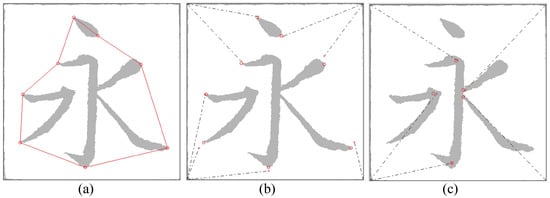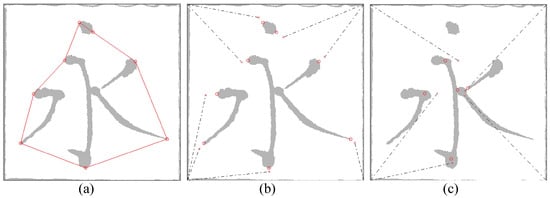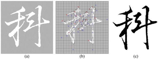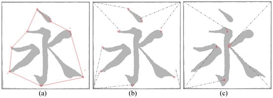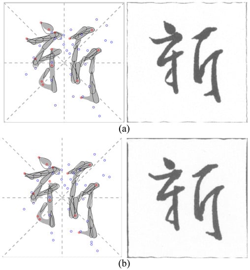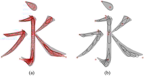 In [8], each Chinese character was systematically decomposed into six layers (layers 0–5), which makes it easier to analyze and segment Chinese characters; this is especially useful for writing in regular script. In this method, constructive ellipses were used to construct the zeroth layer. The trajectory taken by the brush’s tip varies with that of its handle, and the movements taken by the tip will gradually become the same as those of the handle. In [9], the angle of the next brush tip position was obtained by averaging the angles between the movement of the brush’s handle and current position of the brush’s tip, and the rotational center of the brush footprint’s tip was always kept inside the brush footprint. In [3], the deformations of the brush’s spine were modeled by a computer, and the authors used the “equilibrium bend energy” to calculate the relative positions of the brush’s tip and handle when the brush pen was moving.