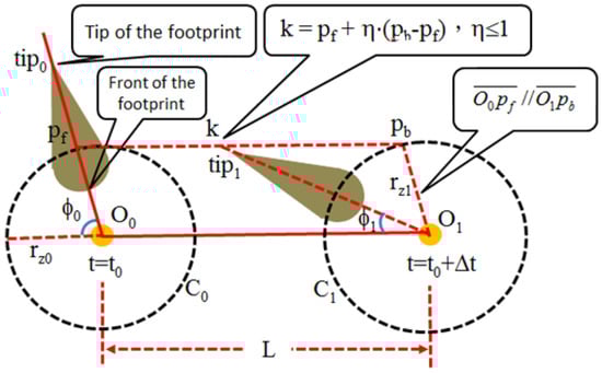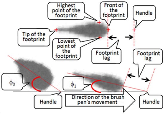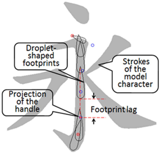 During the writing of each stroke, the brush tip will touch or leave the paper, and the brush’s spine will also tilt to a side, which results in a gap between the handle and brush, as shown in Figure 1a. This is the so-called “footprint lag”, which is defined in Figure 1b. Figure 1b also shows that the footprint left by the brush on the paper resembles a water droplet in shape. Figure 1a has a 3D coordinate system, and the brush is assumed to move along the X-axis, whereas Figure 1b has a 2D coordinate system that exists on a horizontal plane (the paper). The mapping between the location terms in Figure 1a,b is shown in Table 1.