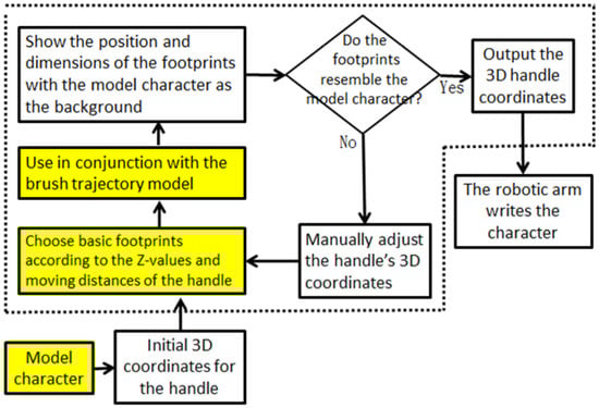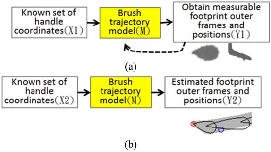 As the robotic arm only has direct control over the handle and not the position of the brush on the paper (i.e., the footprints), the footprint’s size, lag, and angle () will vary with the handle’s coordinates (Figure 4). In this paper, we used the footprint’s size, lag, and angle () as the factors of the brush trajectory model and studied whether the brush’s handle had a relationship with these factors. If there existed the relationship, we were able to use the brush’s handle to control the brush trajectory. Since this work was an experimental study to show whether the brush’s handle position was possible to control the brush trajectory, we did not further explore the control principles in different brush pens. To obtain the relationship between the positions of the brush’s handle and footprints, the robotic arm was made to draw a few basic footprints by sending known handle coordinates to the robotic arm. A set of images where the footprints’ outer frames and positions may be measured was thus produced. By analyzing these images, we obtained a mechanism that allows the robotic arm to write calligraphy by receiving handle coordinates, i.e., the “brush trajectory model” (Figure 5a). Figure 5b illustrates the process by which the brush trajectory model was used to guide users in finding a suitable set of handle coordinates to write a complete character using the robotic arm.