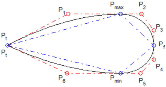 The outer frame of each basic footprint was divided into four Bézier curves. The four sampling points (see Figure 7) are the tip of the footprint ( = (0, 0)), front-most end of the footprint ( = (, )), highest point of the footprint ( = (, )), and lowest point of the footprint ( = (, )). To allow a smooth curve to pass through these four points, to and to were linked by two quadratic Bézier curves, whereas to and to were linked by two cubic Bézier curves. In addition, a few more control points (–) were added to smoothen the Bézier curves, as shown in Figure 7. The control points for the outer frame of a basic footprint are then , , , , , , , , , , , and , , . The computation of the Bézier curves is described below, and we have used the -to- and -to- curves shown in Figure 8 as examples to illustrate this process.