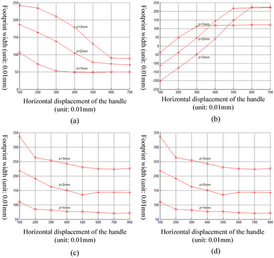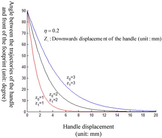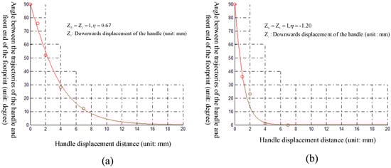 is obtained from measurements. As is directly related to z, and it is much easier to control z than to measure r, we simply measured the correlation between and . To simplify the model’s parameters, was only measured for values of 1, 2, and 3 mm. Figure 10 gives the relationship between the displacement of the handle and its angle to the front of the footprint, with being fixed to 0.2.