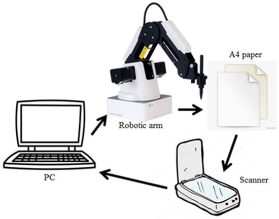 The configuration of our experimental system is shown in Figure 11, and the specifications of this system are as follows: (1) Personal computer: Calculates the coordinates of the handle and passes these coordinates to the robotic arm. (2) Robotic arm: DOBOT ARM 2.0, which has a repeatability of 0.2 mm. The robotic arm was controlled using Python 3.X code. (3) Brush pen: Two refillable brush pens with the same brush-spine length (8.5 mm) but different brush diameters (Figure 12). The brush pen on the top is Brush Pen #1, while the brush on the bottom is Brush Pen #2. (4) A4 paper: Ordinary printing paper. (5) Scanner: A 600 DPI scanner was used to scan the written characters, and the scans were then stored on a PC for analysis.