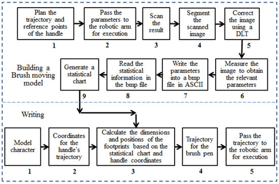 The planning, writing, scanning, and measurement processes require a few known coordinates as reference points for measurement. In this work, the corners of a 20 × 20 mm square were used as reference points. On each A4 sheet, 6 × 3 of these squares were drawn to indicate the working area for the robotic arm. Therefore, each piece of paper only needed to be moved or replaced after 18 operations. The process flow of this experiment is shown in Figure 13. This flow can be divided into two parts: “building the brush trajectory model” and “calligraphy writing”. This experiment involves a total of 14 steps, as shown below.
