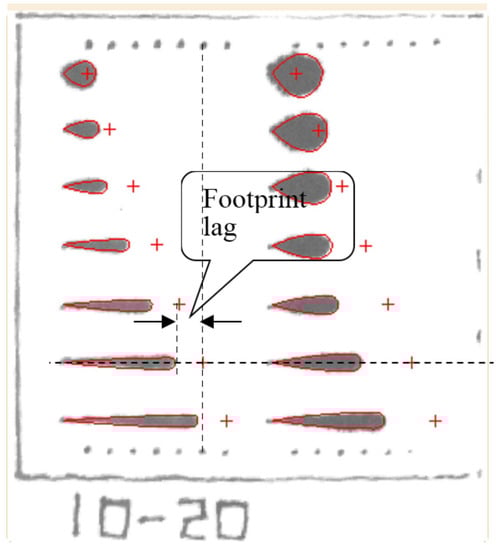 The marks made by a brush will change with the motions and z-axis height of the handle. Figure 14 is a DLT-corrected image of brush footprints, and there are seven basic footprints on the left side of this figure. In these footprints, the handle was pressed downwards from mm to mm and horizontally displaced by 1 to 7 mm. The left end of each footprint is the position of the brush tip at , and the + symbol represents the (x, y) coordinates of the handle when mm. The seven little dots at the top left of this figure are reference points for determining the coordinates of the handle, and the smooth curve around the boundaries of each footprint were formed by drawing four Bézier curves through the footprint’s feature points. The seven basic footprints on the right side of Figure 14 are the same as those on the left, except that the handle was pressed from to mm instead of mm.