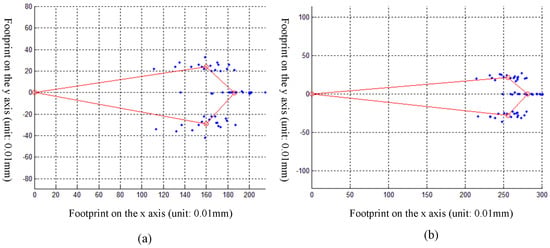 Figure 15a represents the , , , and coordinates of 18 footprints that were produced by displacing the handle by 1 mm downwards (to z = 1 mm) and 3 mm horizontally. Likewise, Figure 15b also shows the , , and coordinates of 18 footprints, but with the handle being horizontally displaced by 4 mm instead of 3 mm.