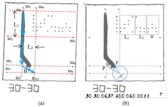Measurement of footprints for a bent line where m represents the coordinate of the projection of the handle. (a) Raw image (580 × 587). (b) Corrected image (2100 × 2500).