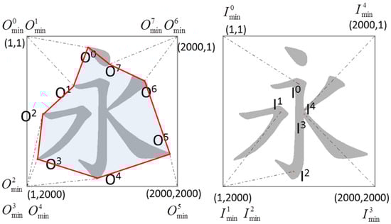 The written characters were evaluated using the methods proposed in [14]. Figure 20 shows the outer frame and intersection points of any two strokes of the character "Yong" where represent the intersection points of any two strokes of the sample and test characters and represent the points on the outer frame of the sample and test characters. and are the shortest and longest distances from to any corner, respectively and and are the shortest and longest distances from to any corner, respectively. To increase the sensitivity of this method to changes in the characters, was changed to . The mathematical equations for the evaluation of character quality are shown below (Equations (9)–(13)).