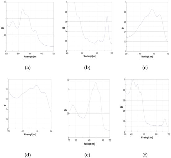 Typical spectral fingerprints of six authentic oils absorbing in the Vis region (360–700 nm): (a)—Pumpkin oil; (b)—Hempseed oil; (c)—Linseed oil; (d)—Soybean oil; (e)—Sea buckthorn oil; (f)—Olive oil.
