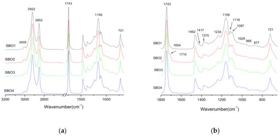 Comparative ATR-FTIR spectra for sea buckthorn (SBO) oils (SBO1-SBO4) in the whole region (3600–650 cm−1) (a) and in the fingerprint region (1800–650 cm−1) (b).