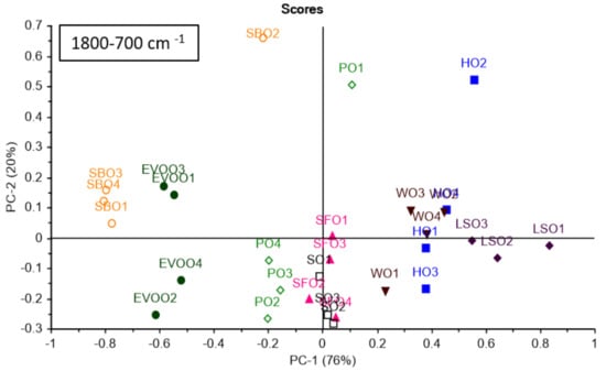 From the whole spectra (3600–700 cm−1) and for the fingerprint region (1800–700 cm−1), the PCA scores for all oil classifications are shown in Figure 3. Using Unscrambler X10.4 software, the first few PCs described most of the observed variance, showing distinct segregation and clustering between the eight groups of oil. Firstly, for the fingerprint region, an explained variance of 76% (PC1) and 20% (PC2) covered the total variance of 96% (Figure 3). For the whole domain (3600–700 cm−1) the first 2 PCs had an explained variance of 71% (PC1) and 21% (PC2) covering a total variance of 92% and no significant overlapping of samples (data not shown)