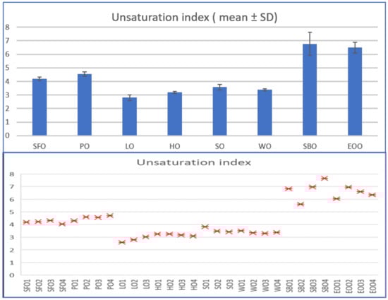Mean (upside) and individual (downside) values of the unsaturation index, reflecting the features of the 8 groups of oils, as well as the similarities among oils. SFO—Sunflower oil; PO—Pumpkin oil; LO—Linseed oil; HO—Hempseed oil; SO—Soybean oil; WO—Walnut oil; SBO—Sea buckthorn oil; EOO—Olive oil.