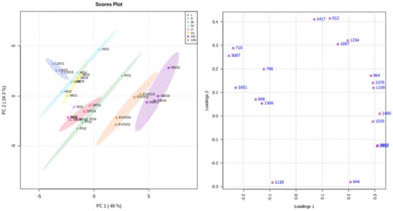 Using Metaboanalyst algorithms on the matrix M, the PCA analysis (scores and loadings) was performed again (see Figure 5), as well as the PLSDA score plot coupled with the dendrogram derived from cluster analysis (Figure 6).
