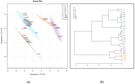 Partial least squares with discriminant analysis (PLSDA) score plot and dendrogram cluster analysis for the 8 groups of oils (I to VIII). For the group individual affiliation and abbreviations see Table 1. (a) Partial least squares with discriminant analysis (PLSDA) score plot (b) and dendrogram cluster analysis for the 8 groups of oils (I to VIII)