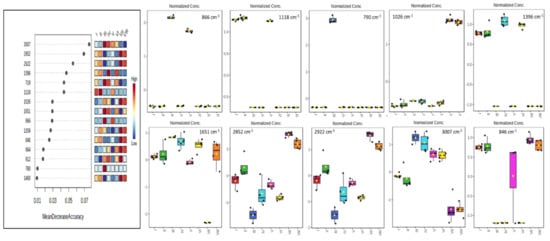Based on the same M matrix, using a cutoff p value < 0.001 and FDR cutoff value of 0.005 (see Table 3), the ANOVA univariate analysis using Random forest algorithm and post-hoc analysis by Fischer’s least significant difference (LSD) were performed. It was possible to rank the most significant wavenumbers which may be considered as predictive biomarkers for a good discrimination among the eight groups of oils. Figure 7 shows the ranking of the first MDA values, useful to identify the significant wavenumbers which may predict the identity and authenticity of these oils. In the left side of the figure, one can see 3007, 2852, 2922, 1396, 717, 1118, 1026, 1651, and 866 cm−1 to be the highest ranked wavenumbers.