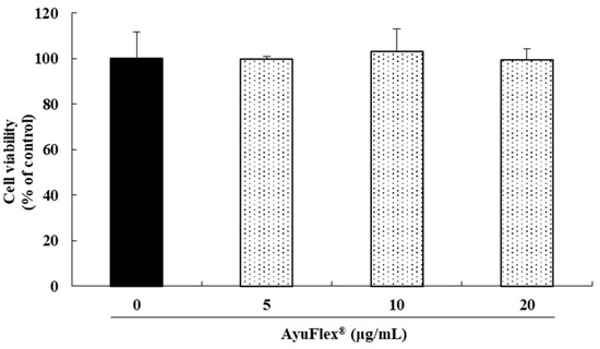 The influence of AyuFlex® on the cell viability of HCHs was confirmed by using the MTT analysis. AyuFlex® did not show cytotoxicity at any of the concentrations (5, 10, and 20 μg/mL) investigated in this study (Figure 1).