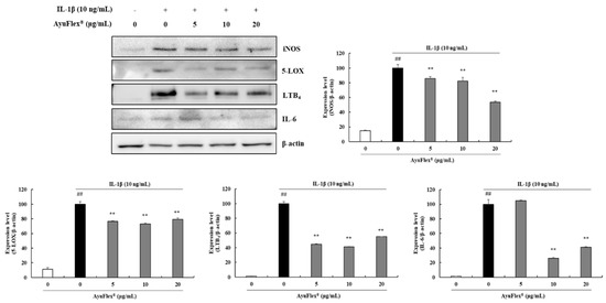 To confirm the anti-inflammatory effects of AyuFlex®, HCHs were simultaneously treated with each concentration of AyuFlex® (5, 10, and 20 μg/mL) and IL-1β (10 ng/mL) for 24 h. The protein presenting of iNOS, 5-LOX, LTB4, and IL-6 was investigated by western blotting. IL-1β was revealed to significantly induce the protein expression of iNOS, 5-LOX, LTB4, and IL-6 against the vehicle control. In contrast, the expression of iNOS, 5-LOX, LTB4, and IL-6 in HCHs treated with a combination of AyuFlex® and IL-1β decreased in the range of 14–46% (p < 0.01), 20–26% (p < 0.01), 44–58% (p < 0.01), and 58–74% (p < 0.01), respectively (Figure 2).