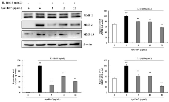 As MMPs play major roles in cartilage destruction, we appraised the effects of AyuFlex® on MMP-2, -3, and -13 expression in IL-1β-treated HCHs by western blot analysis. Our results revealed that IL-1β considerably upregulated the expression of MMP-2, -3, and -13 contrasted with that in the untreated- and vehicle control treated-HCHs. Treatment of HCHs with a combination of AyuFlex® and IL-1β considerably reduced the protein expression of MMP-2, -3, and -13 in the range of 20–43% (p < 0.01), 39–72% (p < 0.01), and 38–77% (p < 0.01), respectively (Figure 3).