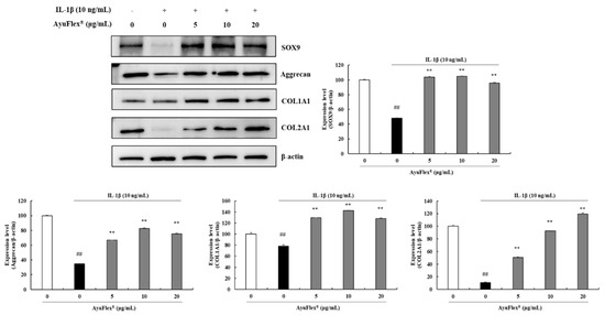 The effects of AyuFlex® on the expression of collagen synthesis-involved proteins in IL-1β-treated HCHs was investigated using western blotting. The protein levels of SOX9, aggrecan, COL1A1, and COL2A1 were assessed. As shown in Figure 4, IL-1β significantly reduced SOX9, aggrecan, COL1A1, and COL2A1 expression in contrast with that in the vehicle control. As shown in Figure 4, AyuFlex® treatment considerably upregulated the expression of SOX9, aggrecan, COL1A1, and COL2A1 compared to that in IL-1β-stimulated HCHs. Treatment with AyuFlex® (5, 10, and 20 μg/mL) increased SOX9, aggrecan, COL1A1, and COL2A1 expression compared with that in the IL-1β-stimulated HCHs (1.9–2.1-fold, p < 0.01; 1.9–2.3-fold, p < 0.01; 1.6–1.8-fold, p < 0.01; 4.7–11.1-fold, p < 0.01, respectively).
