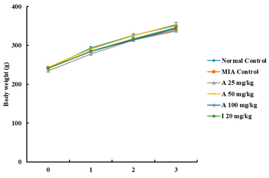 The effects of AyuFlex® on body weight in rats with MIA-incurred OA was investigated. The body weight of all animals was measured once a week and the changes were recorded for three weeks. No significant differences were observed between the six groups (Figure 6) for three weeks, and these results demonstrated that the body weight was not influenced by AyuFlex®.